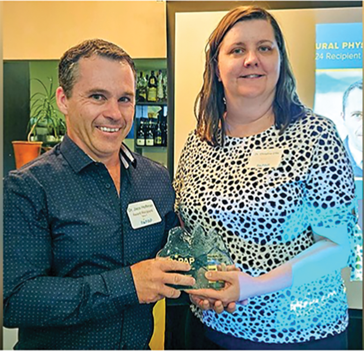Dr. Jaco Hoffman receives the 2024 Rhapsody Physician Award from Dr. Christine Ellis, RhPAP board member, at a special celebration event held in Olds on June 13, 2024.